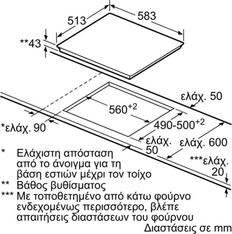 • Διαστάσεις εντοιχισμού (Υ Π Β) (mm): 43 x 560 x 490-500