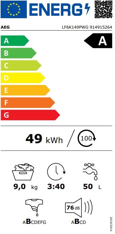 - Σταθμισμένη κατανάλωση ενέργειας σε kWh ανά 100 κύκλους πλύσης του προγράμματος eco 40-60 (ΕΕ 2017/1369): 49
