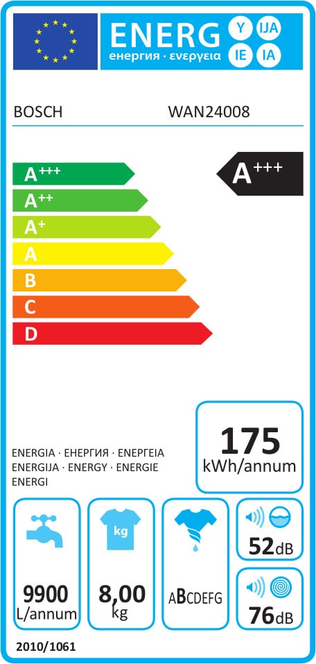 - A+++ (-10%): καταναλώνει 10% λιγότερη ενέργεια από την κλάση Α+++ (175 kWh, με όριο κλάσης A+++ τις 196 kWh)