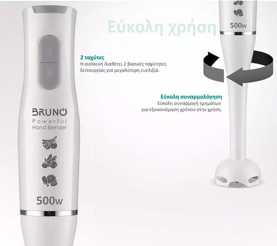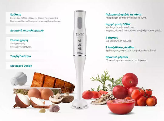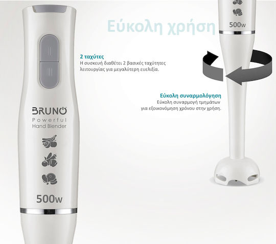 Το ραβδομπλέντερ της Bruno είναι ιδανικό για θρυμματισμό, ανάμειξη και πολτοποίηση ρευστών και συμπαγών υλικών. Εξοπλίζεται με ισχυρό μοτέρ 500W, 2 ταχυτήτων. Η ράβδος διαθέτει λεπίδες από ανοξείδωτο ατσάλι και είναι αποσπώμενη για εύκολο καθάρισμα.