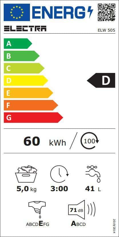 Το πλυντήριο ρούχων Elw 505 από τον κατασκευαστή Electra, έχει χωρητικότητα κάδου κατάλληλη για έως και 5 κιλά άπλυτων ρούχων, και μπορεί να καλύψει τις ανάγκες ενός ατόμου. Η φόρτωση των ρούχων γίνεται από τη στρογγυλή πόρτα στο μπροστινό μέρος της συσκευής, και για τον λόγο αυτό ονομάζεται εμπρόσθιας φόρτωσης.