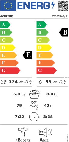 Είναι ενεργειακής κλάσης E, που σημαίνει ότι έχει συνολικά μεγάλη κατανάλωση, σε σχέση με τα υπόλοιπα πλυντήρια – στεγνωτήρια ρούχων ενεργειακής κλάσης D και άνω. Διαθέτει 15 επιλογές διαφορετικών προγραμμάτων, ώστε να προσαρμόσετε το πλύσιμο ή το στέγνωμα, ανάλογα με το είδος των ρούχων που έχετε τοποθετήσει στον κάδο.