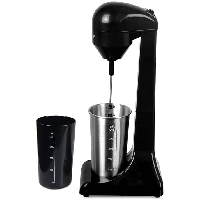 Διαθέτει ένα inox ποτήρι 500ml με εξωτερική ένδειξη μέτρησης, ιδανικό για αφρόγαλα, milkshake κ.ά.. Επιπλέον συμπεριλαμβάνεται και πλαστικό μαύρο ποτήρι 450ml με εξωτερική ένδειξη μέτρησης, κατάλληλο για καφέ, dressing, κ.ά..
