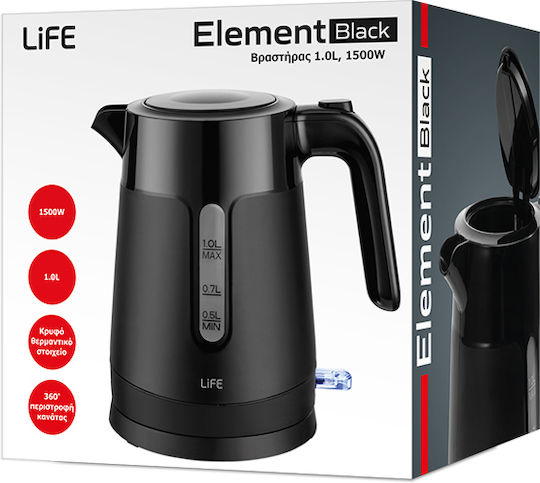 Βραστήρας 1.0L 1500W σε μαύρο χρώμα. Ο κομψός βραστήρας 1.0 λίτρου LIFE ELEMENT συνδυάζει μοντέρνο σχεδιασμό και υψηλή λειτουργικότητα.