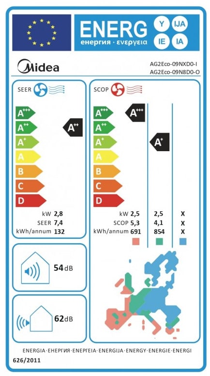 Το κλιματιστικό ανήκει στην ενεργειακή κλάση A++, στην ψύξη και στην ενεργειακή κλάση A+ στη θέρμανση (μέση ζώνη). Η ενεργειακή κλάση μετριέται σε μια χρωματική κλίμακα επτά βαθμίδων από Α+++ έως D, με την κλάση Α+++ να είναι η αποδοτικότερη, ενώ αντίθετα η κλάση D, η ελάχιστα αποδοτική.