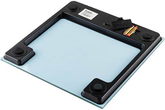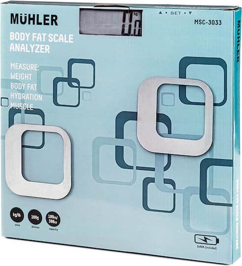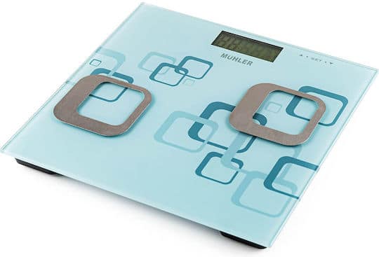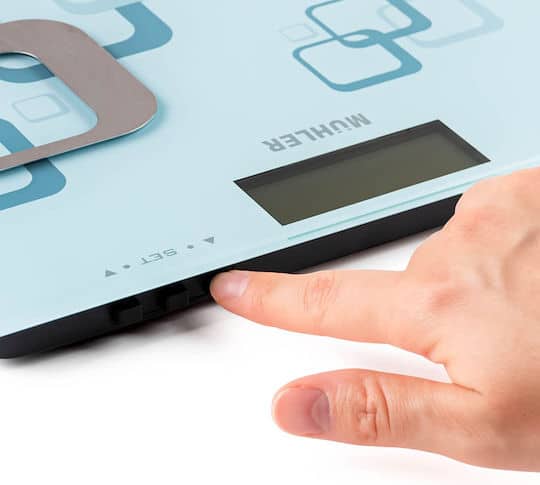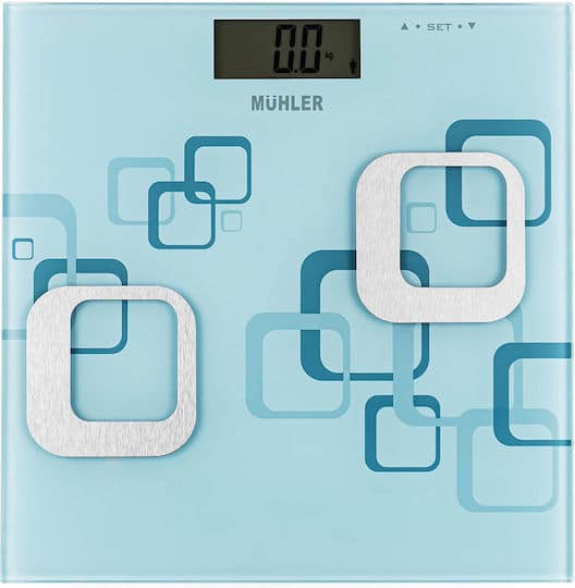 Ψηφιακή ζυγαριά μπάνιου σε μπλε χρώμα της εταιρείας Muhler, κατάλληλη για μέτρηση του σωματικού βάρους έως και 180 κιλά.
