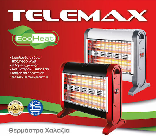 Η σόμπα χαλαζία της εταιρείας Telemax έχει ισχύ 1600 Watt. Είναι ιδανική για να ζεστάνετε άμεσα χώρους όπως υπνοδωμάτια, γραφεία ή μικρά σαλόνια. Δεν απαιτεί προθέρμανση και σε λίγα δευτερόλεπτα φτάνει τη μέγιστη θερμοκρασία με ομοιόμορφη και στοχευμένη κατανομή της θερμότητας. Η υπέρυθρη θέρμανση που προσφέρει είναι καθαρή, χωρίς οσμές ή συγκέντρωση σκόνης.